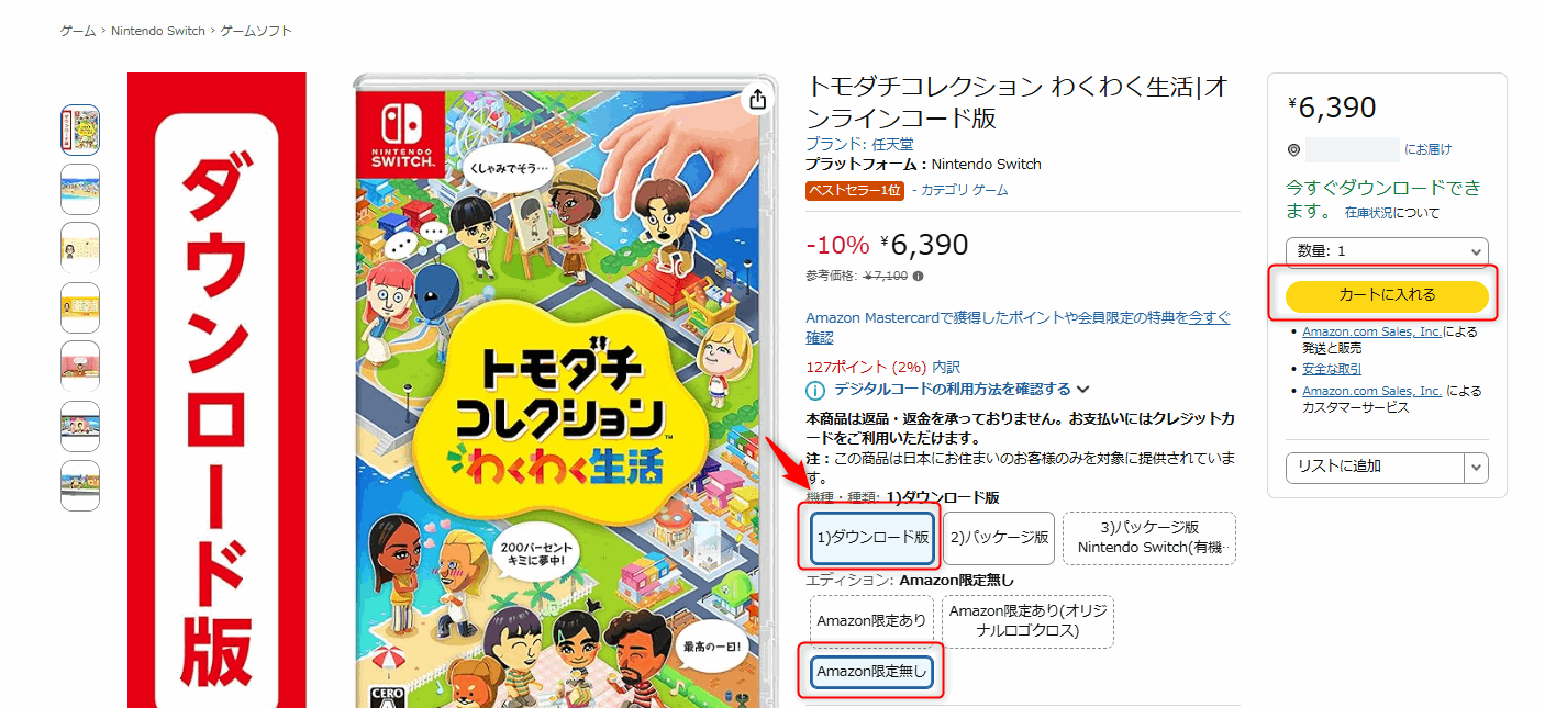 この記事では、実際にAmazonでトモダチコレクションわくわく生活ダウンロード版(Switch)を購入した手順を画像つきでわかりやすくまとめています。
