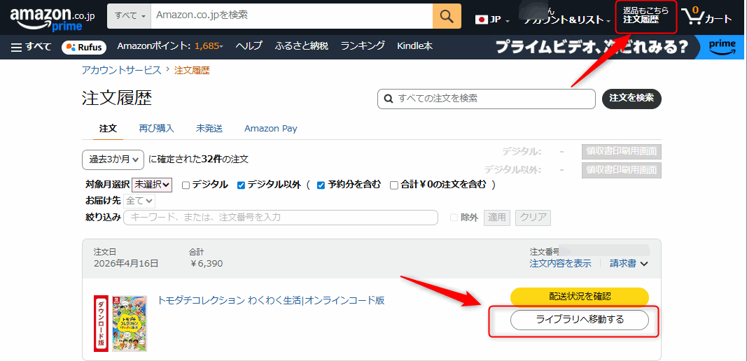 注文履歴からトモコレオンラインコード版の「ライブラリへ移動する」をクリックします。