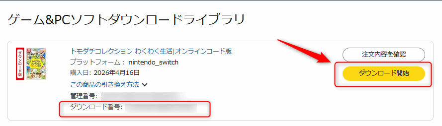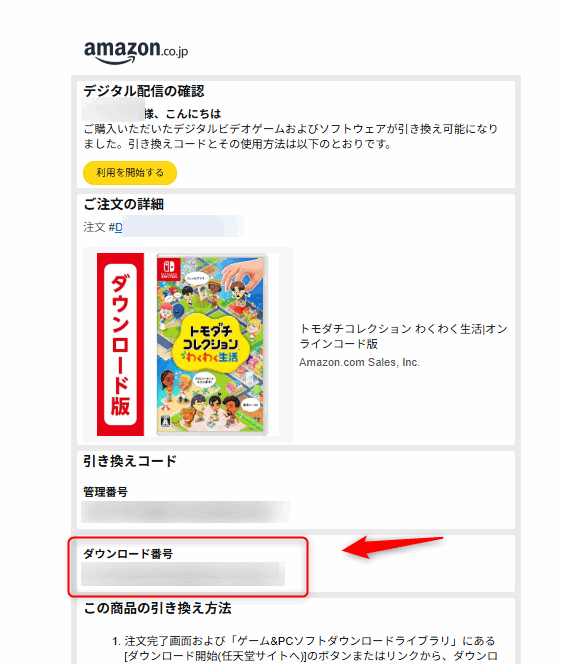 購入すると、Amazonのアカウント内にダウンロード番号が表示されます。メールでも「トモダチコレクション わくわく生活|オンラインコード版の引き換えコードはこちらです。」という件名でコードが届いています。